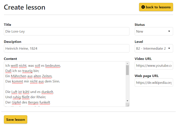 This is a simple form to create a new lesson. You can enter the title, the description, and the actual content of the lesson. You can just paste the text you copied in the Content text area. Furthermore, you can also set the Status (when created, it is New by default), specify the level (this is just an information for the author of the lesson), put the link to the video (this is for now only available for YouTube videos), and the link to the source of the content. This is how my form looks after I enter the words for Heinrich Heine's poem "Die Lore-Ley".