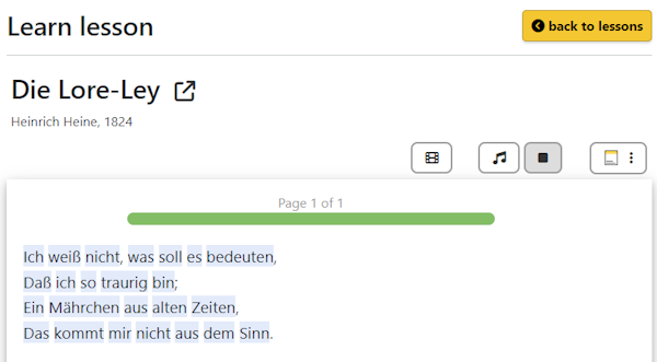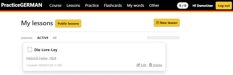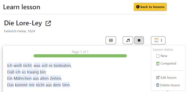 If your browser supports Web Speech API and has German voices available, you will be able to play audio for the lesson. And next to the audio buttons, you have a menu where you can change status for the lesson (new, in progress, completed) and access edit and delete pages for the lesson.