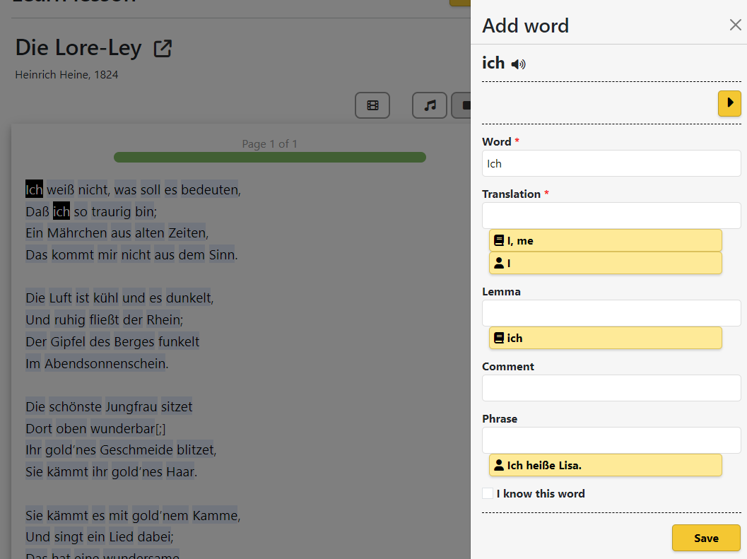 If you want to create a lesson, first you will need to find the content. This can be a text from a German news portal, or perhaps subtitles from a YouTube video, maybe some song lyrics that you found online, movie subtitles, or perhaps whole books. On the Resources page you can find links to many different materials suitable for learning German.